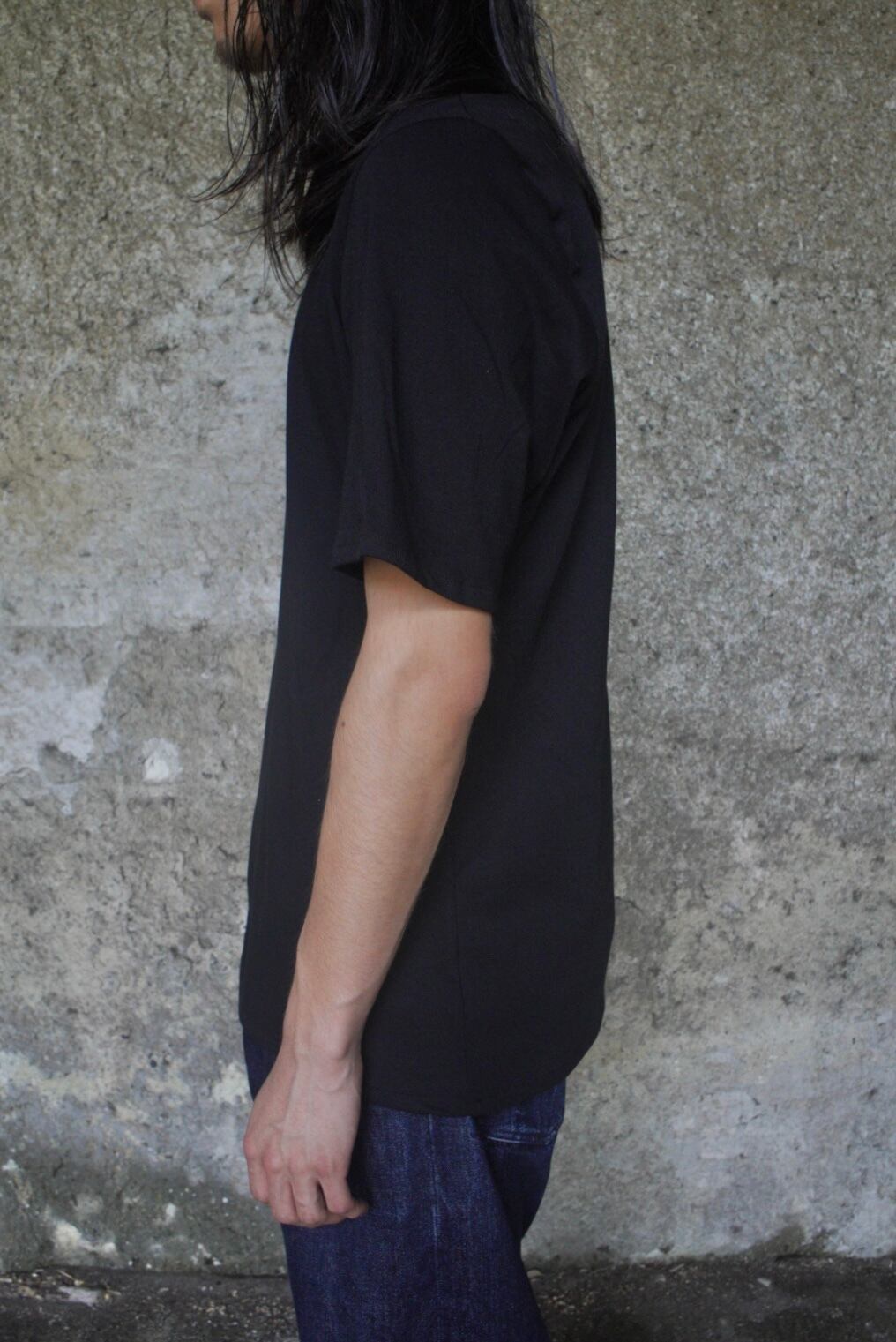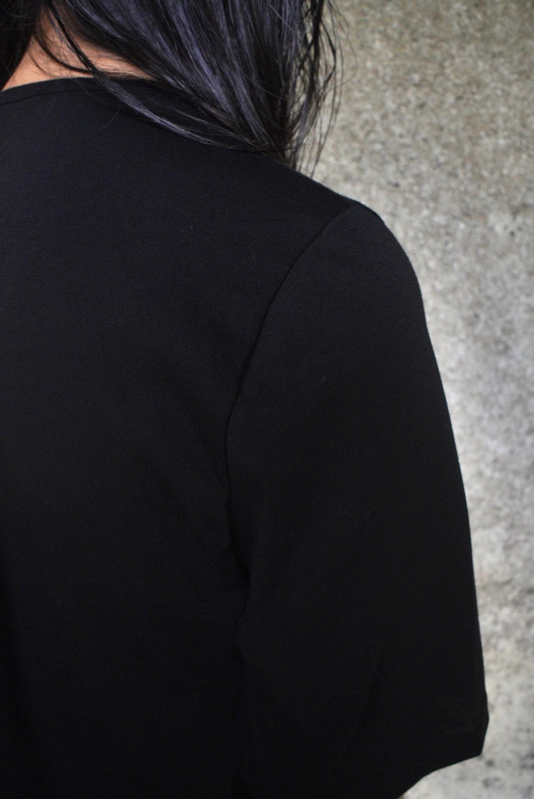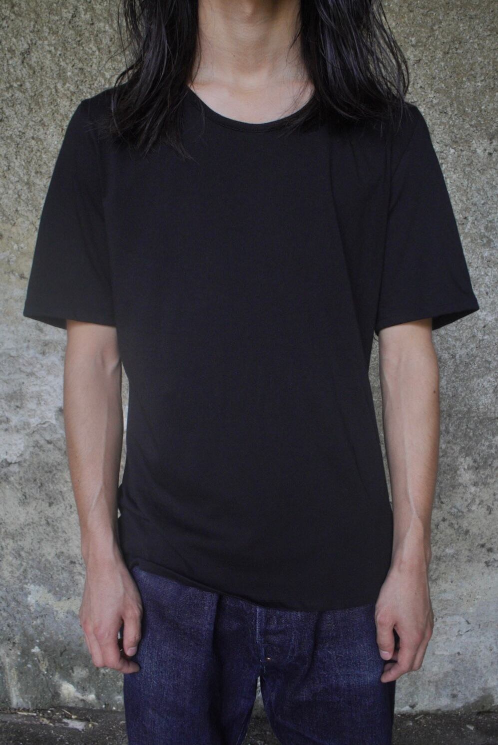 やや広めに設計したネックラインと細めのリブが上品さを引き立て、袖山に高さを出すことで腕まわりに自然な立体感を表現。着丈と身幅のバランスによる、縦のラインを意識したシルエットがモードな佇まいです。