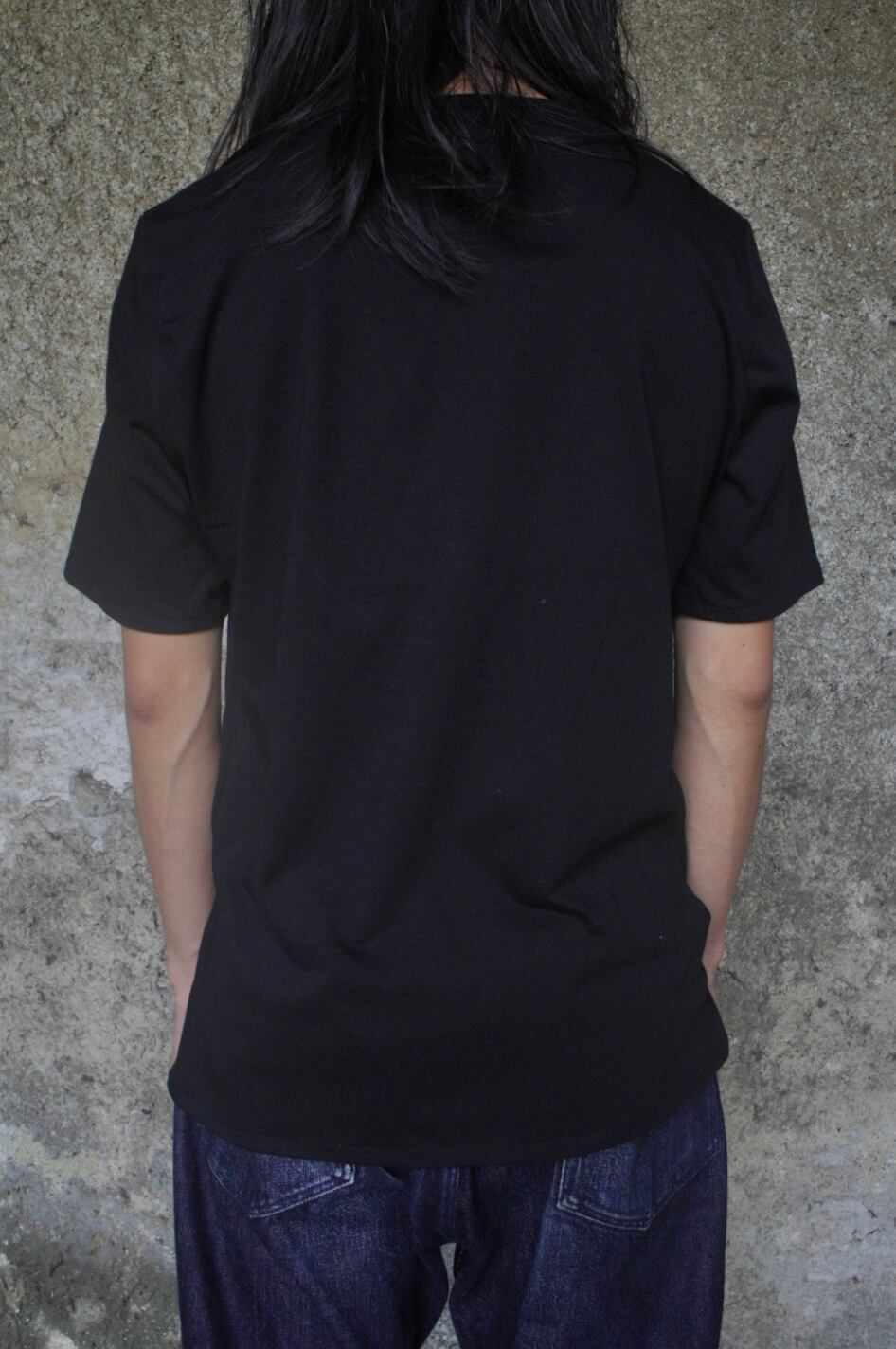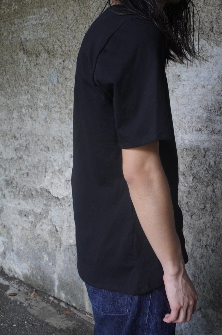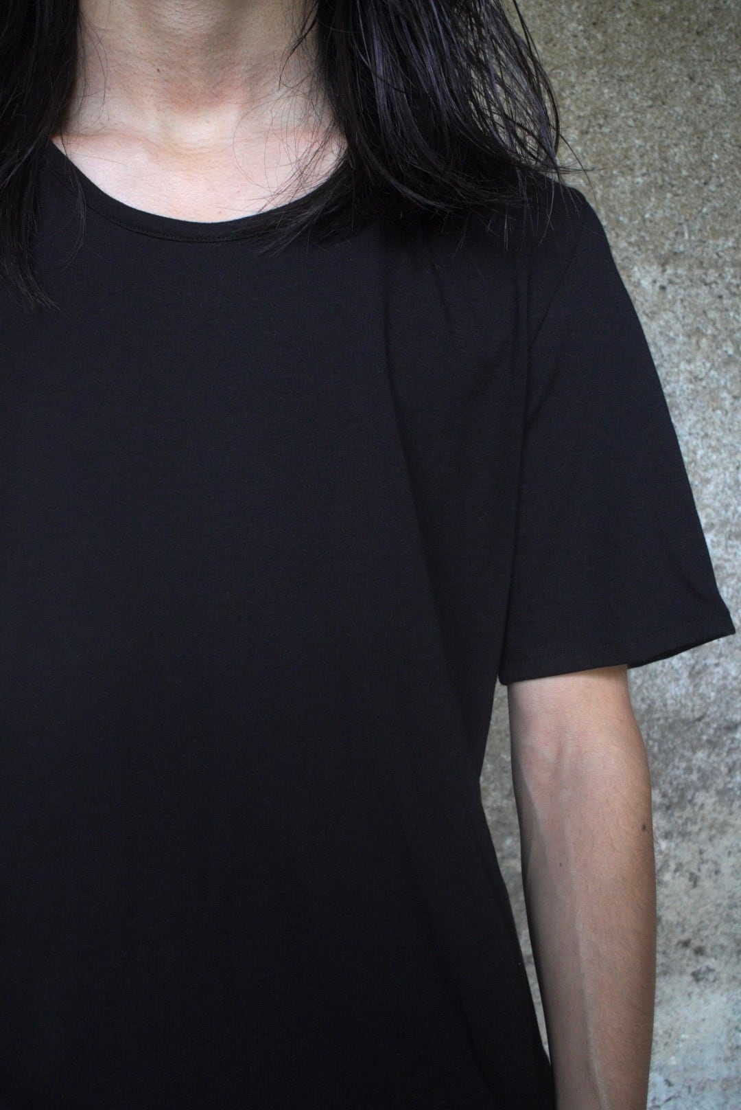 やや広めに設計したネックラインと細めのリブが上品さを引き立て、袖山に高さを出すことで腕まわりに自然な立体感を表現。着丈と身幅のバランスによる、縦のラインを意識したシルエットがモードな佇まいです。