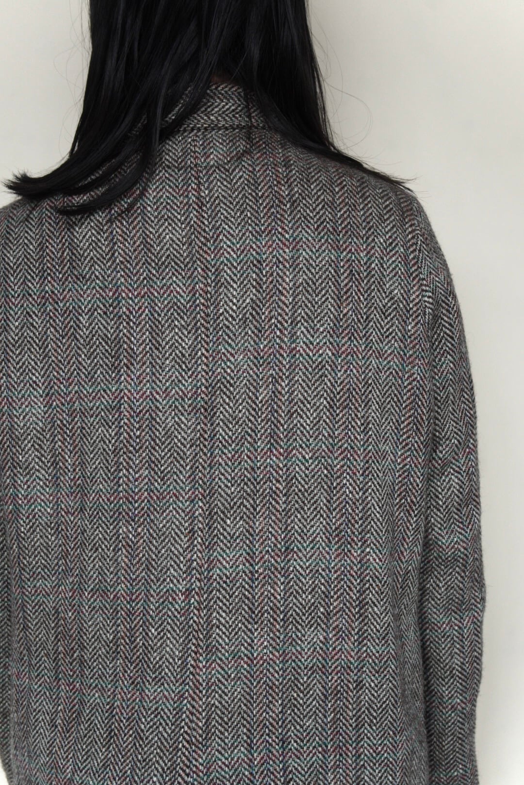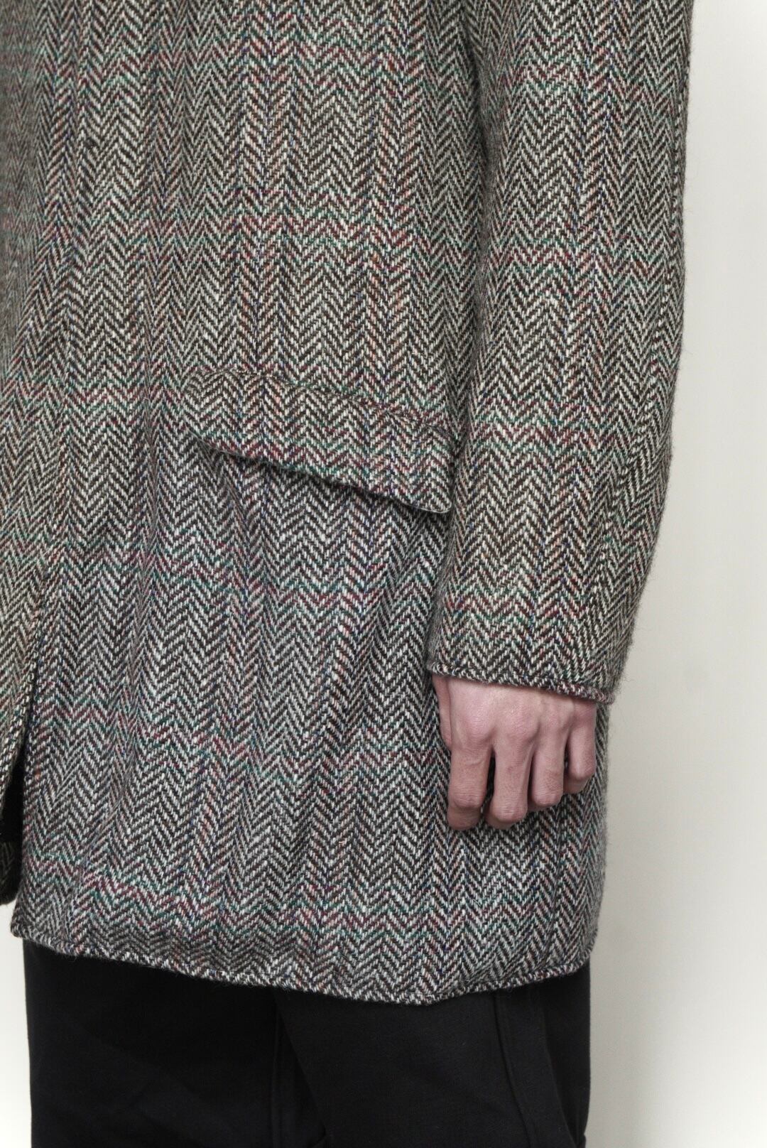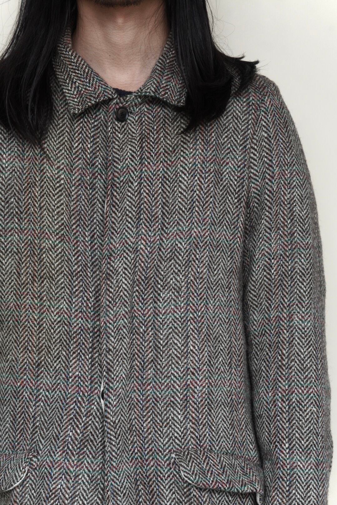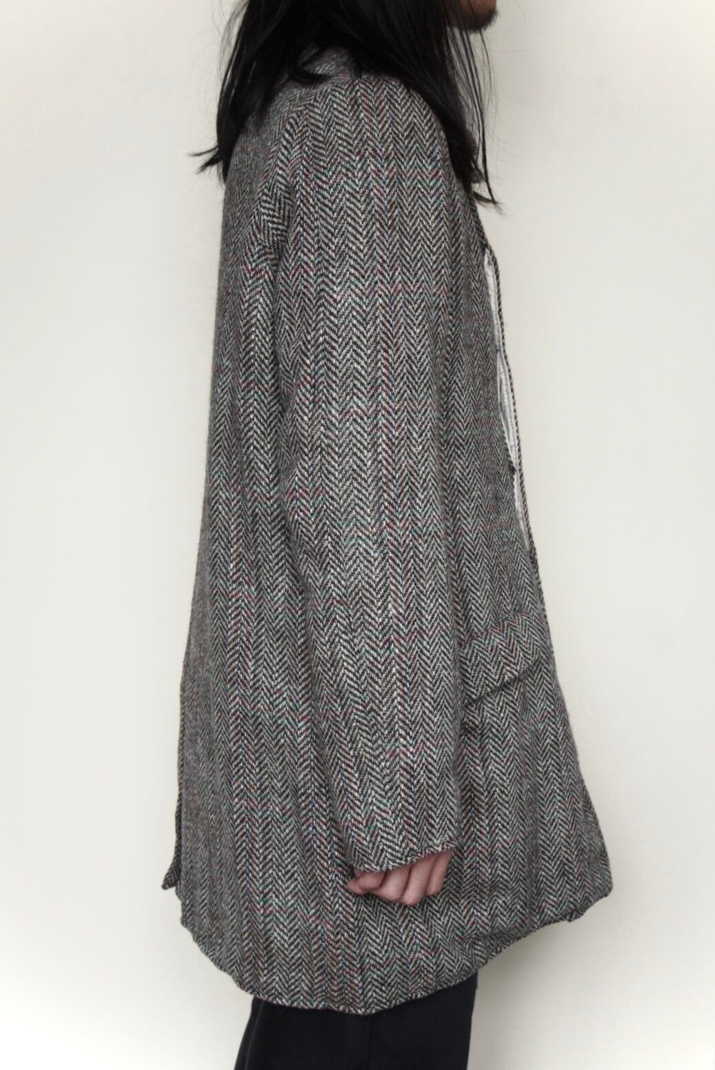 大胆なヘリンボーン柄のウールコート。 -ウール 100% -コットンのライニング -バッファローホーンボタン -フラップ付きポケット2箇所 -バックにスリット 着丈 86cm | 肩幅 41cm | 身幅 57cm | 袖丈 62cm