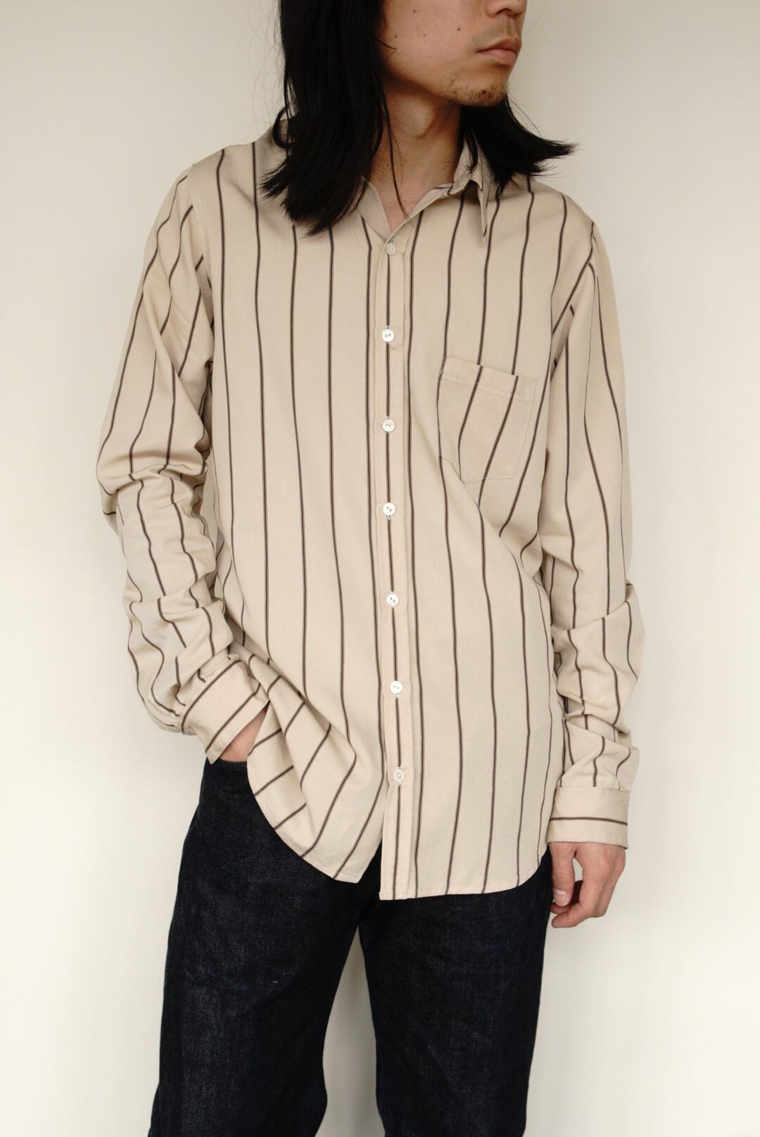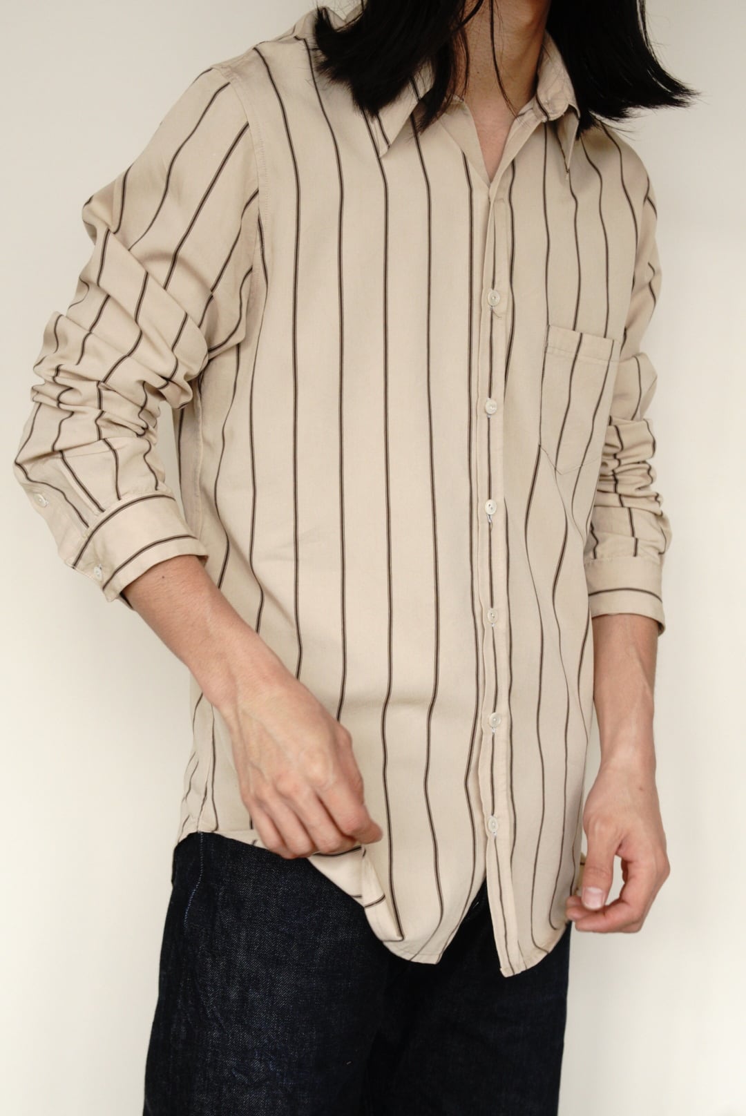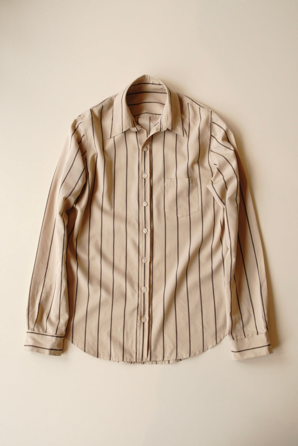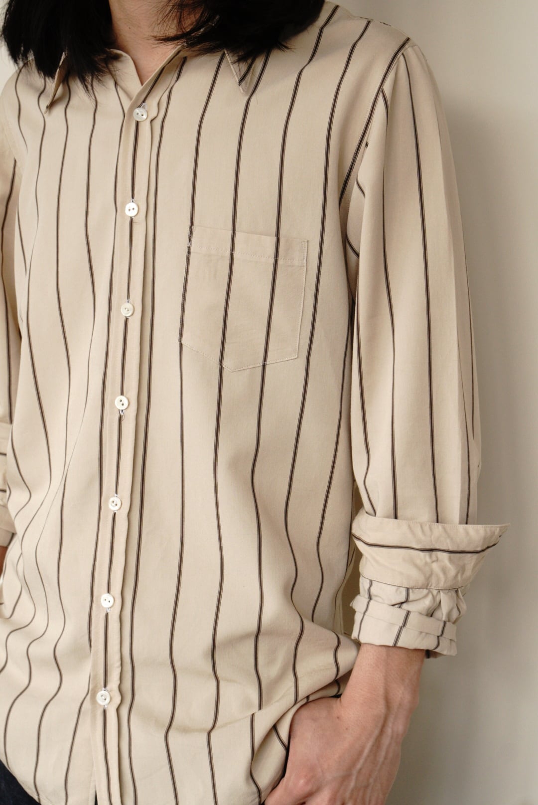 洗練された印象のウールシャツ。イタリア製の薄手ウール生地による美しいドレープと、さらりとした手触りが魅力です。上品なストライプと落ち着いた色味に、縦長でスリムなシルエットを掛け合わせています。