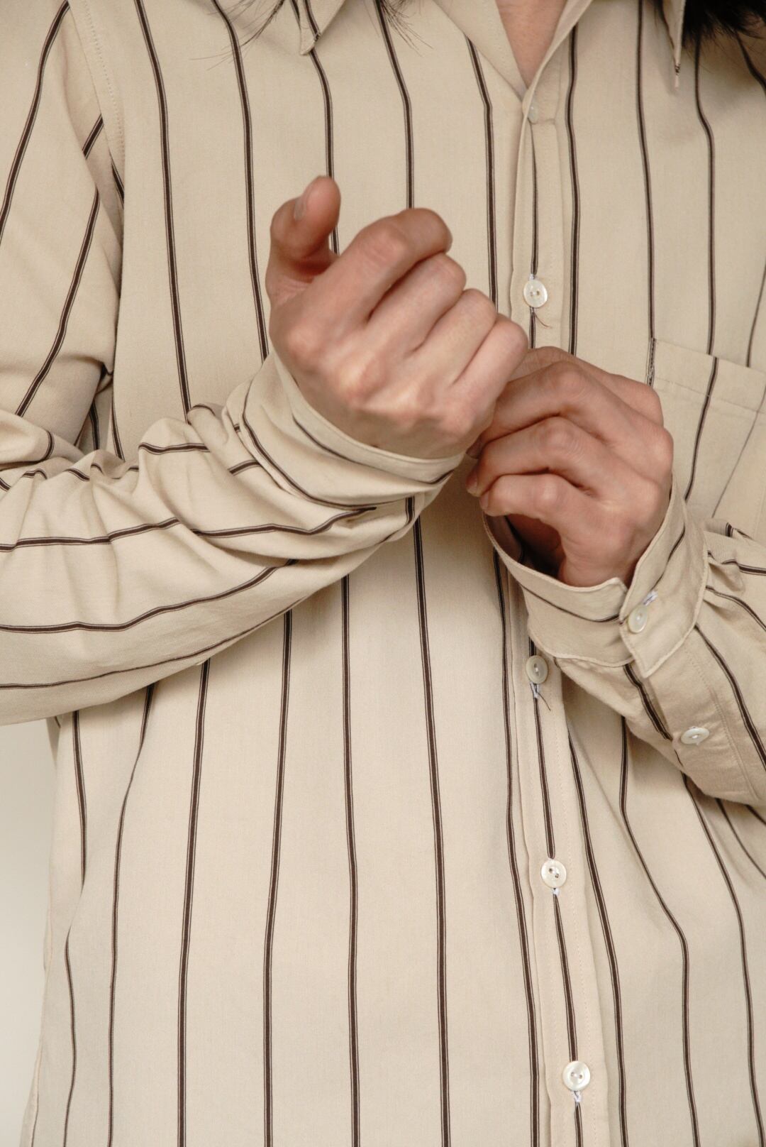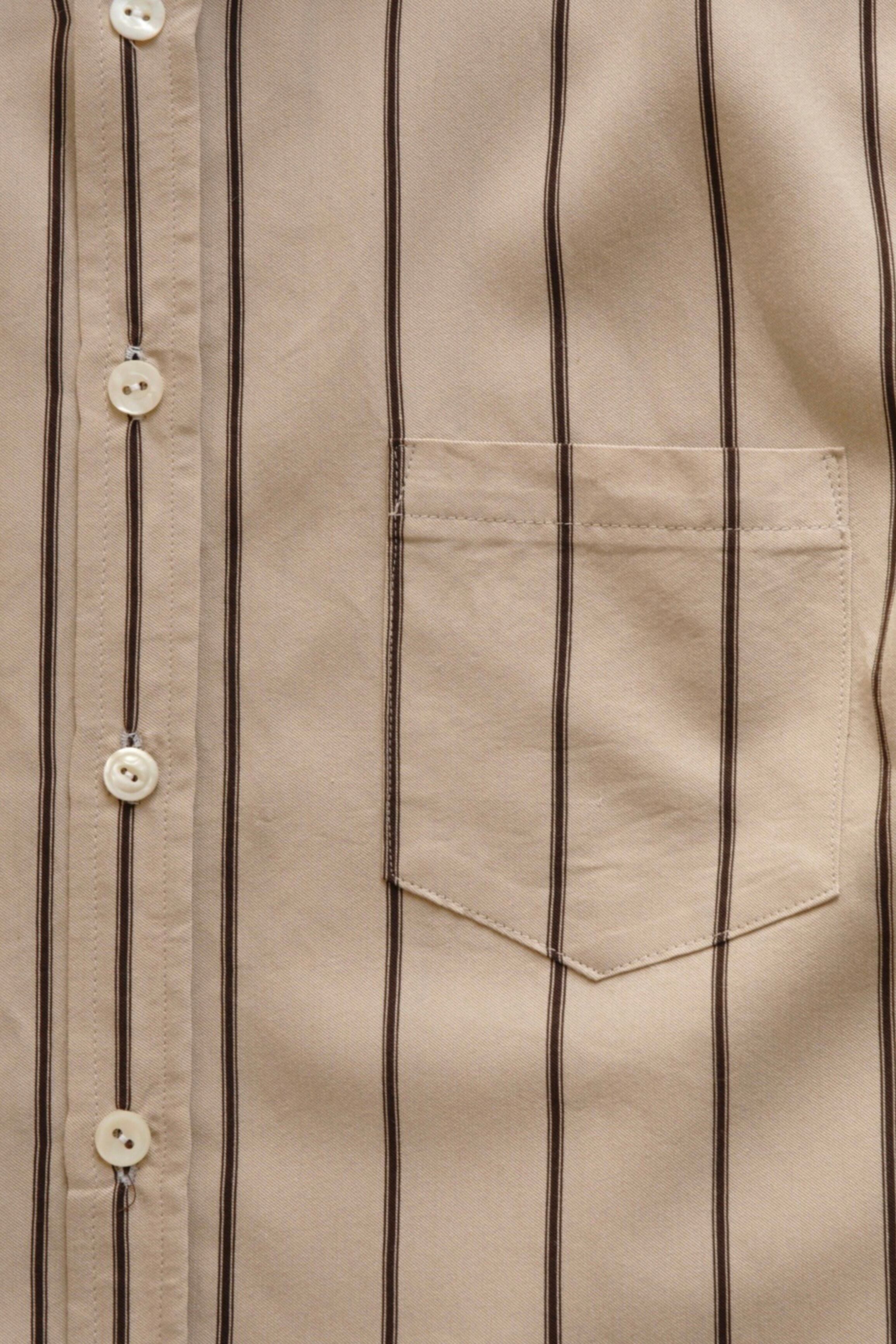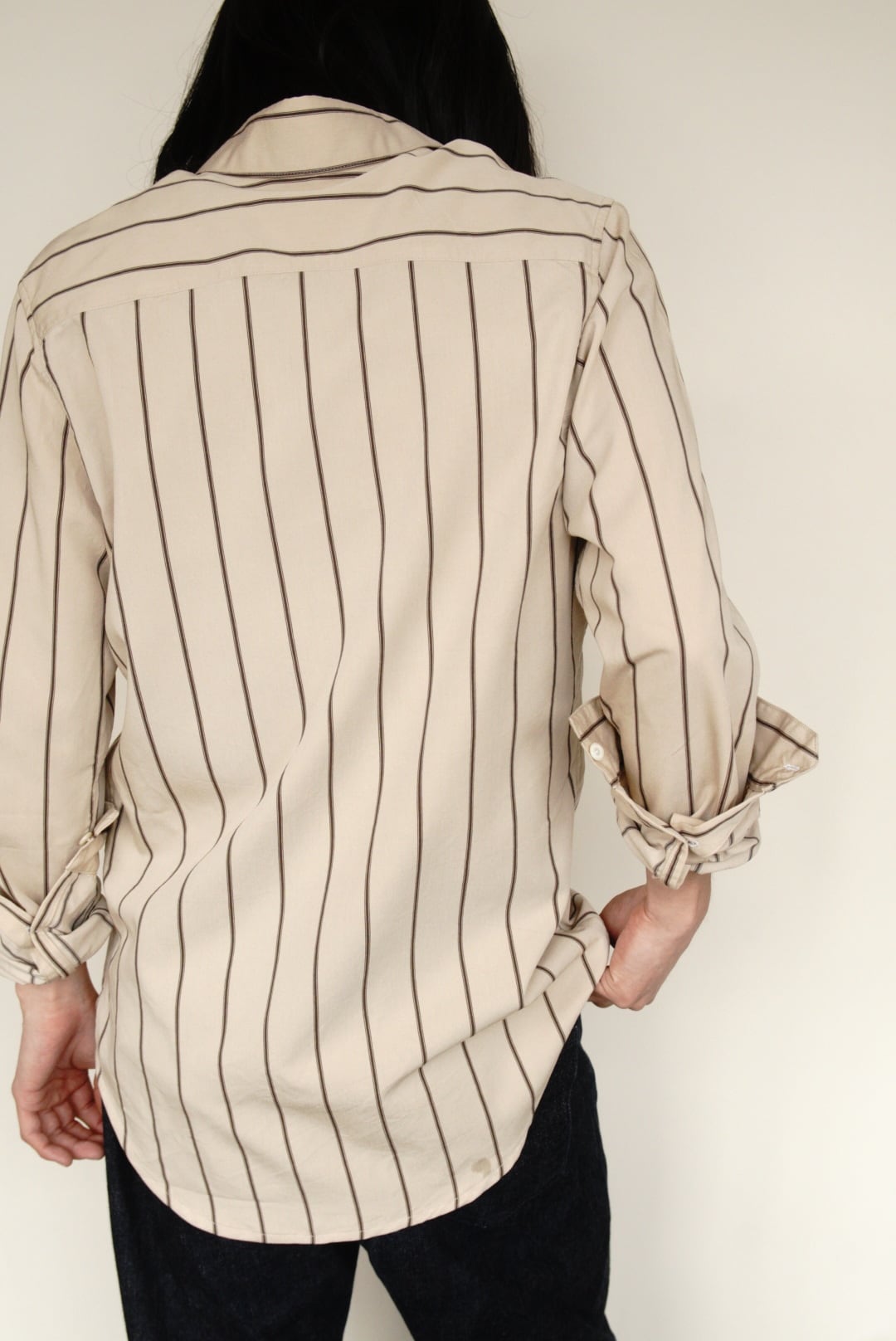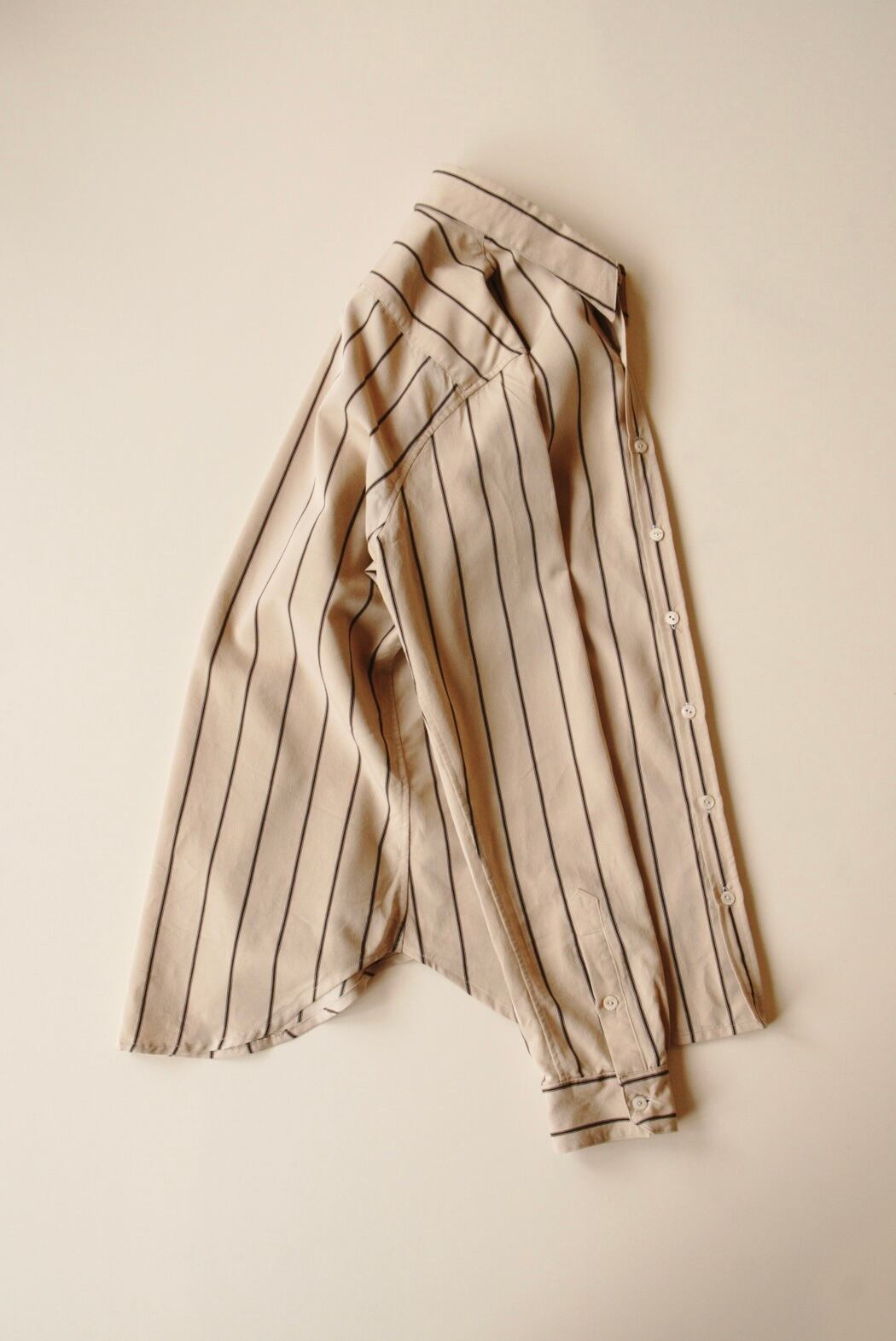 洗練された印象のウールシャツ。イタリア製の薄手ウール生地による美しいドレープと、さらりとした手触りが魅力です。上品なストライプと落ち着いた色味に、縦長でスリムなシルエットを掛け合わせています。