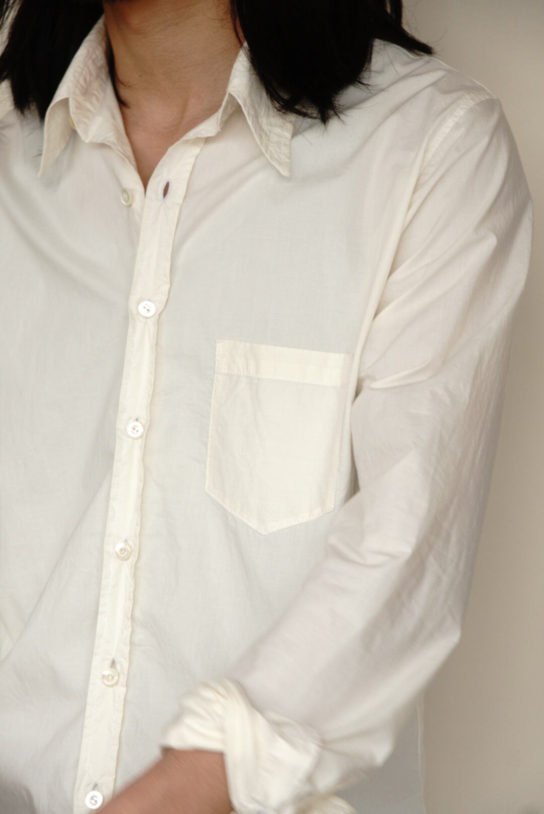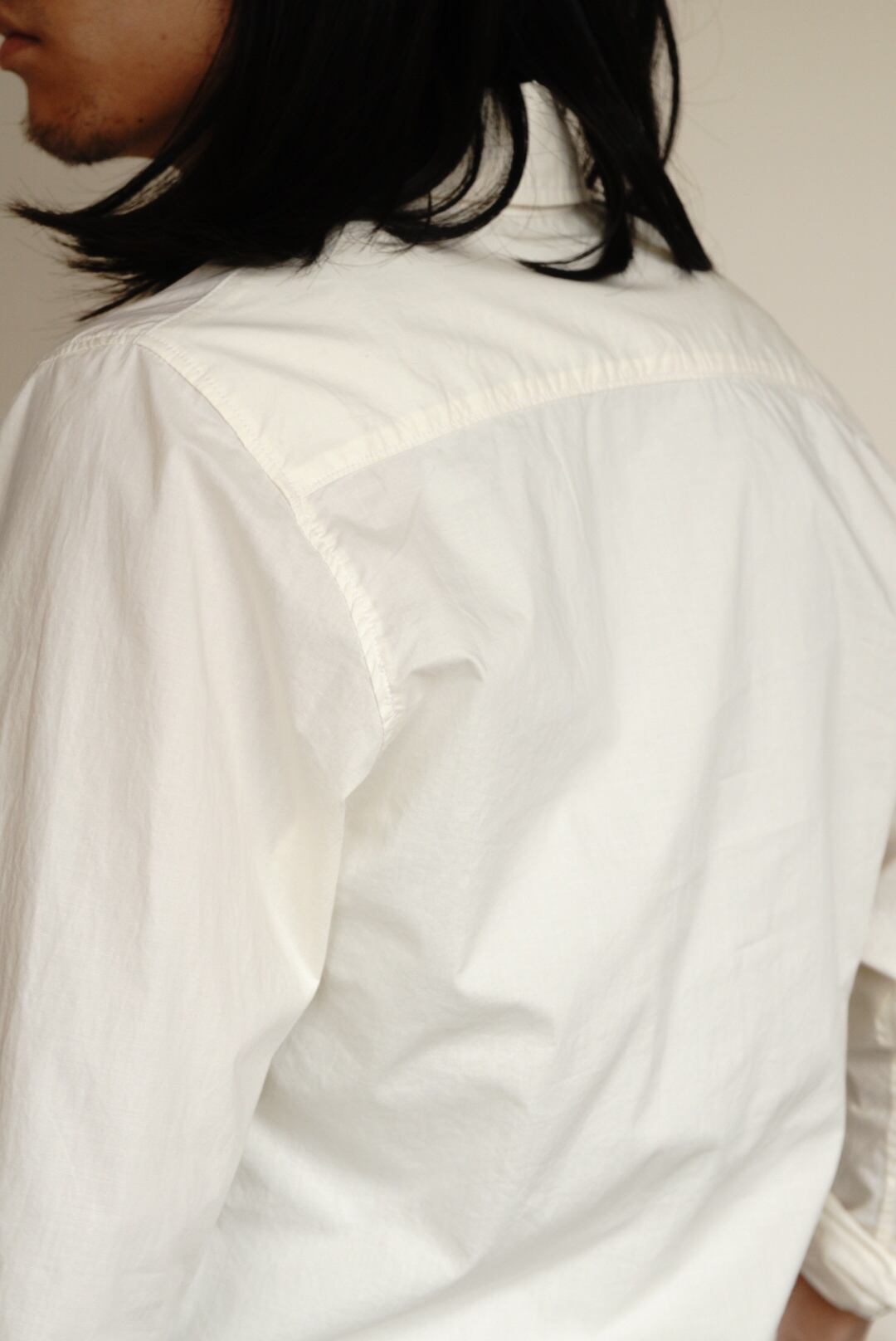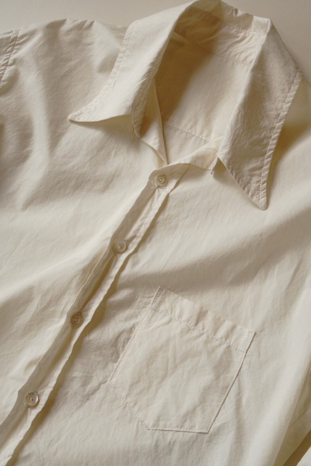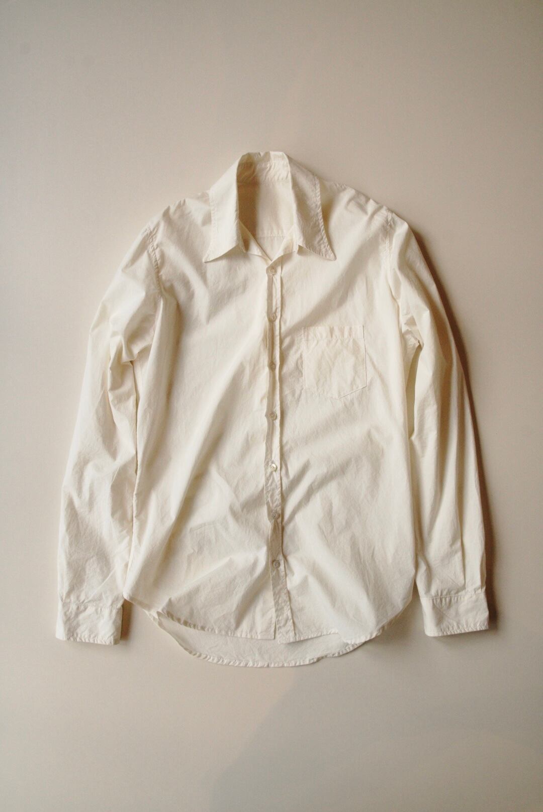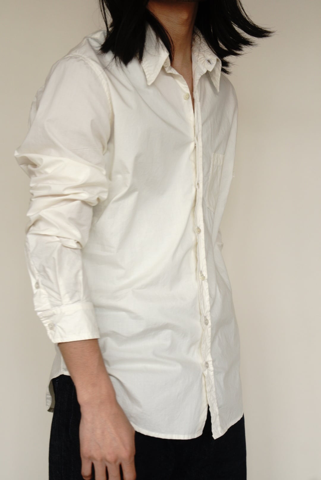 ベーシックなコットンシャツ。ハリのある生地と程よい透け感が特徴です。縦長のスリムシルエットで、カジュアルにも取り入れやすい一着です。