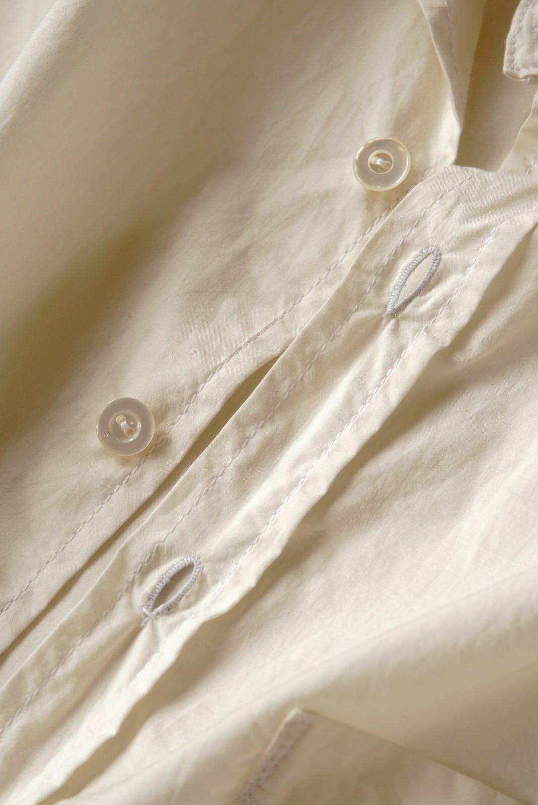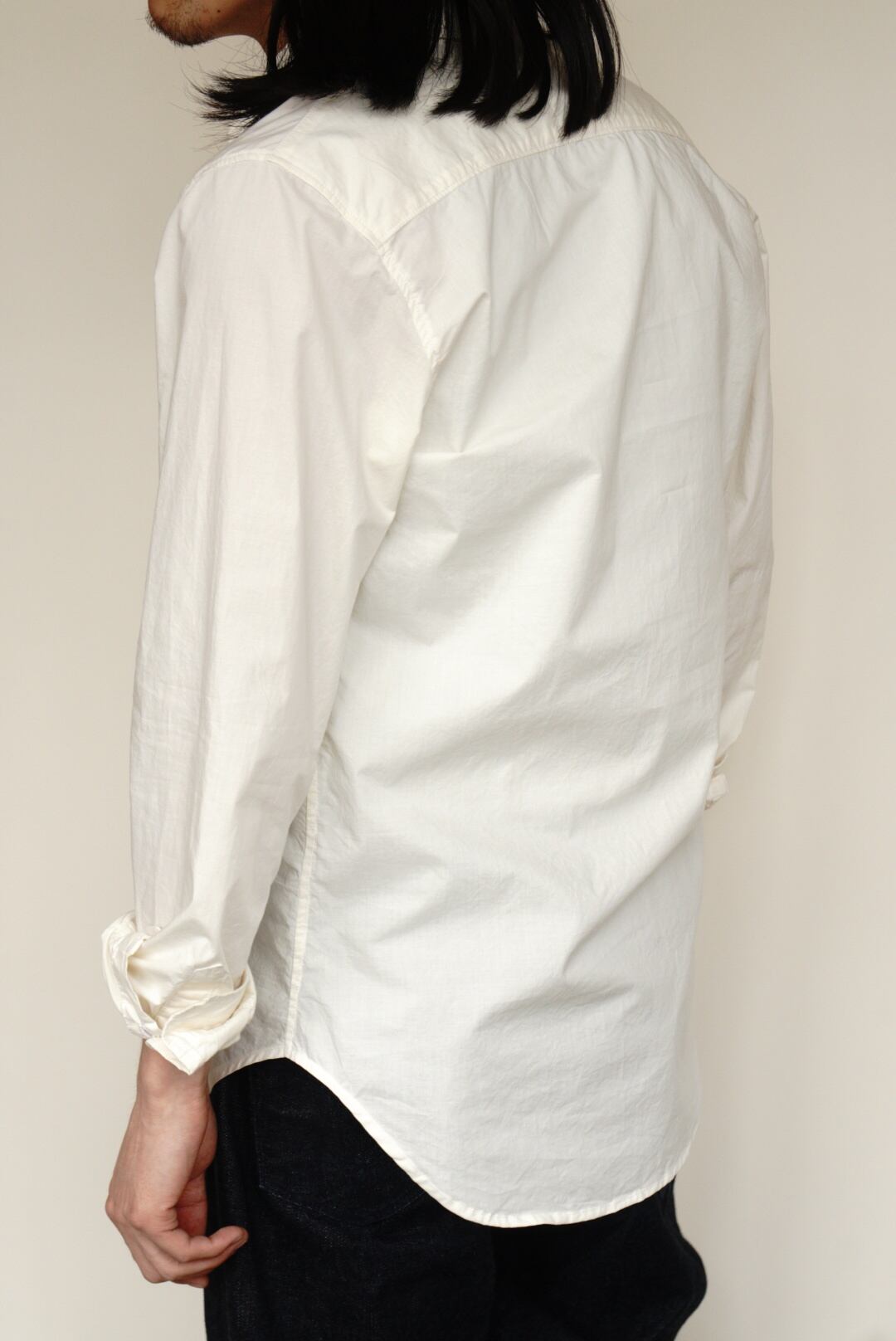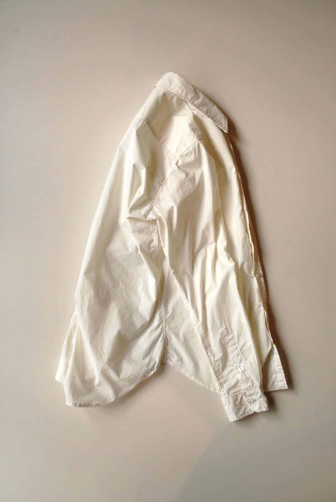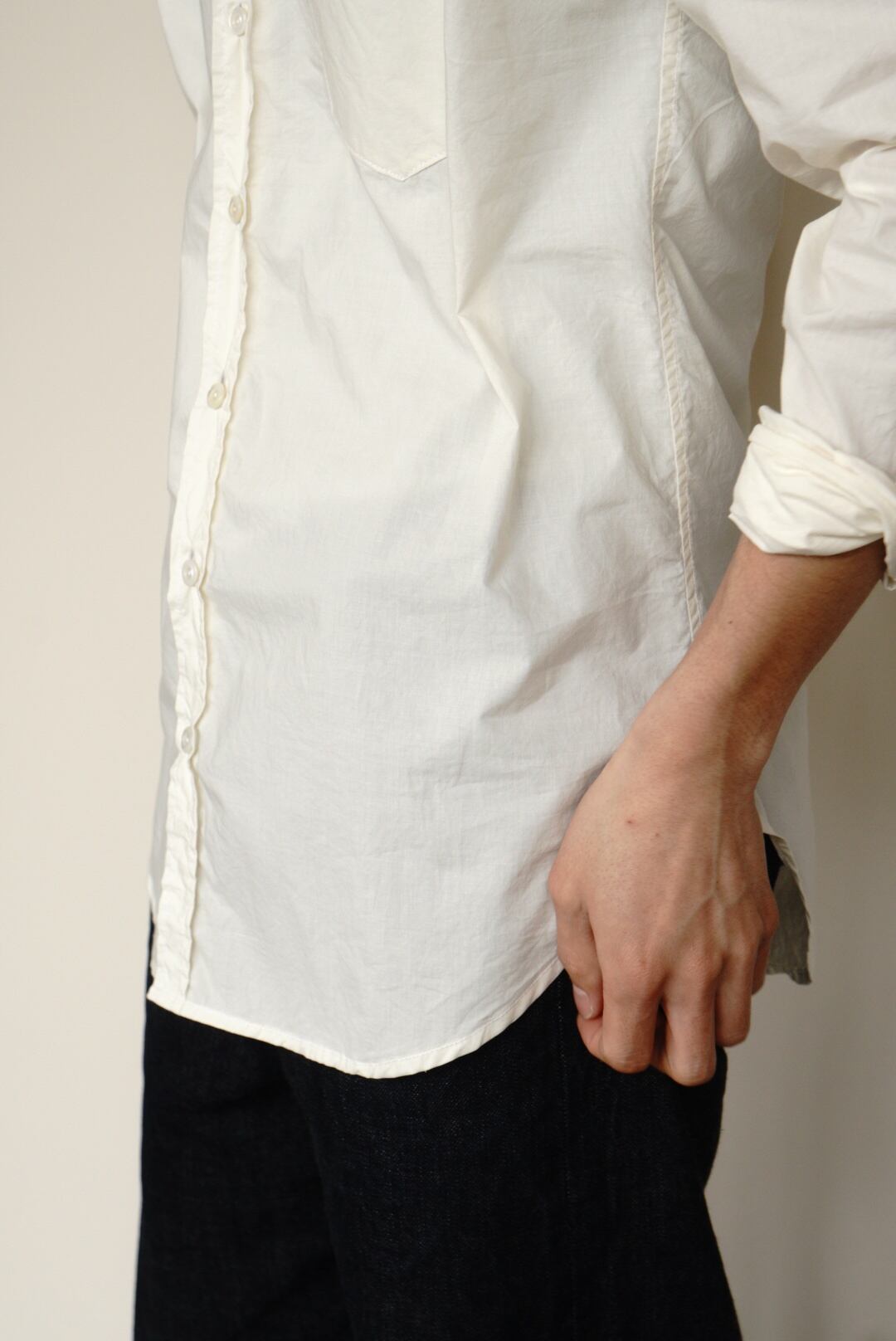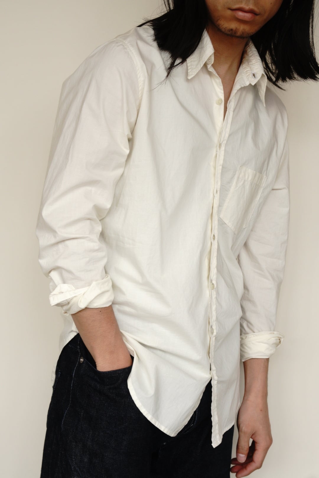 ベーシックなコットンシャツ。ハリのある生地と程よい透け感が特徴です。縦長のスリムシルエットで、カジュアルにも取り入れやすい一着です。