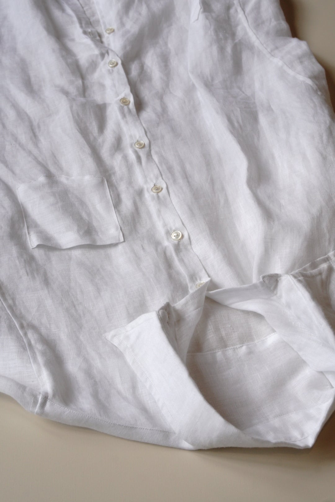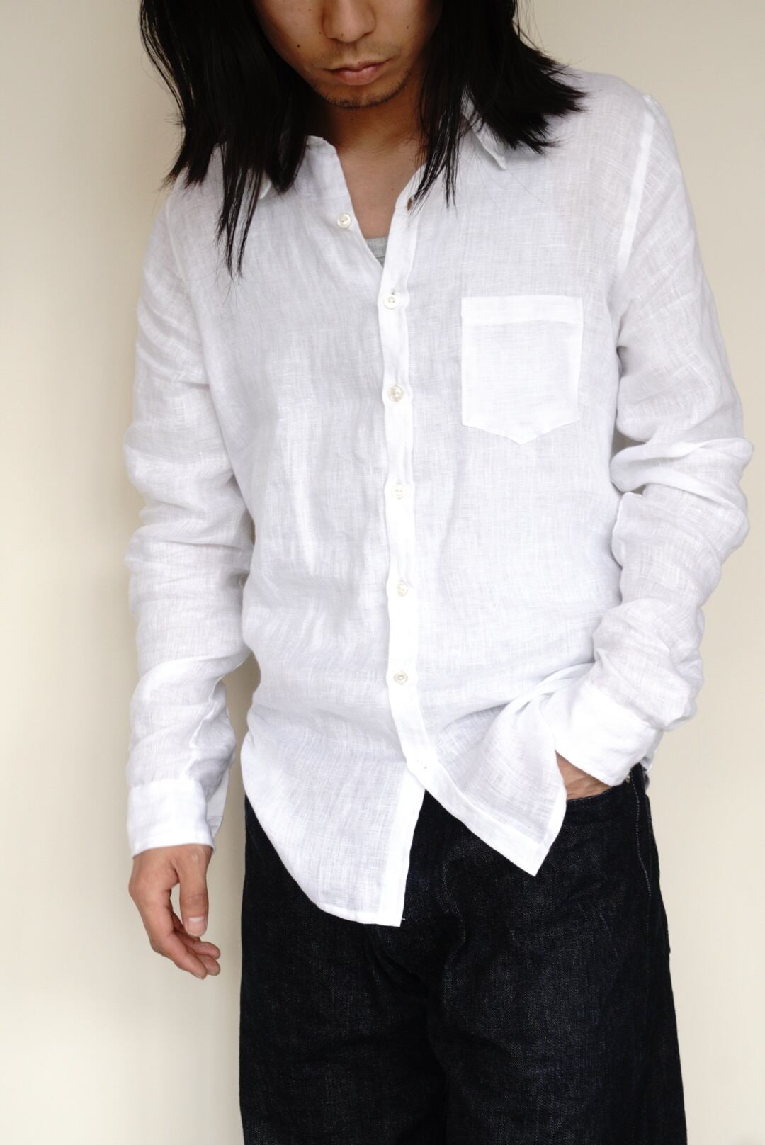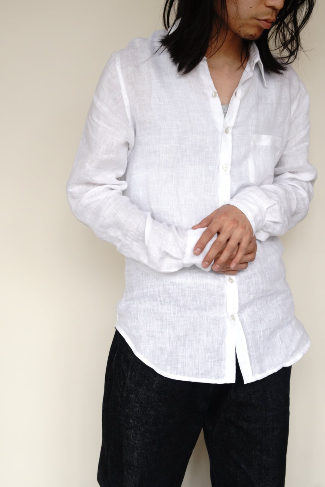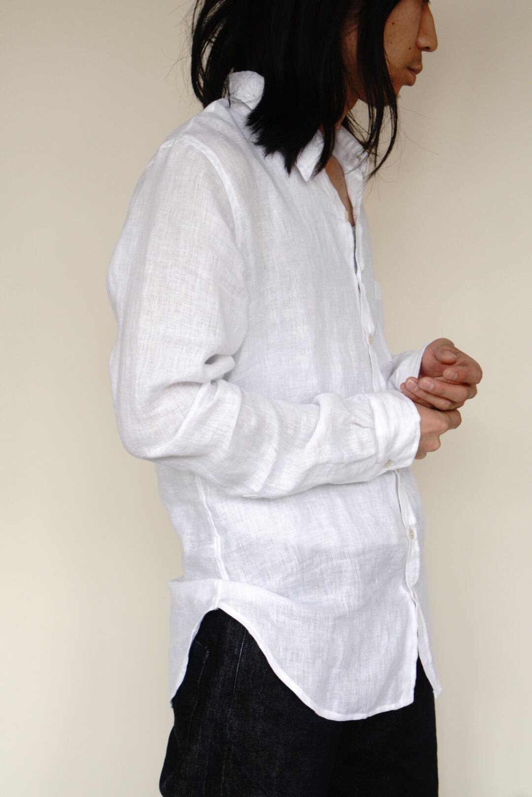 ベルギー製の上質なリネンを使用し、程よい軽さと透け感が涼やかな印象を与えます。洗いざらしたような柔らかなテクスチャーと、縦長でスリムなシルエットが特徴です。