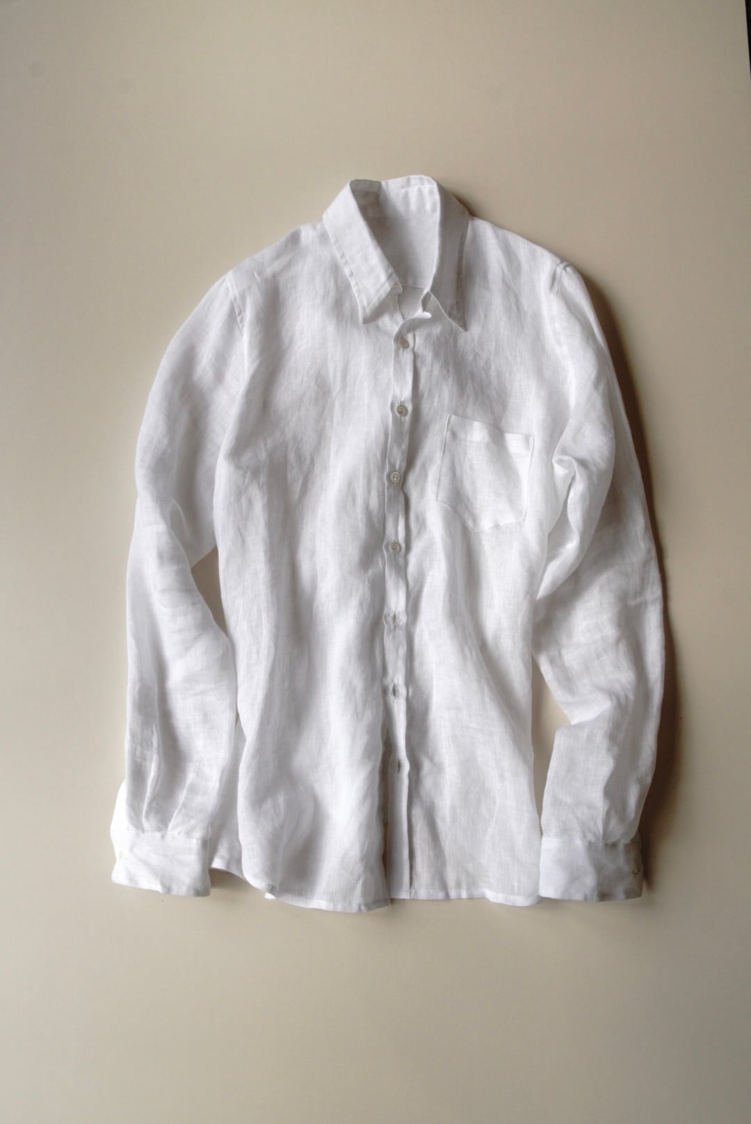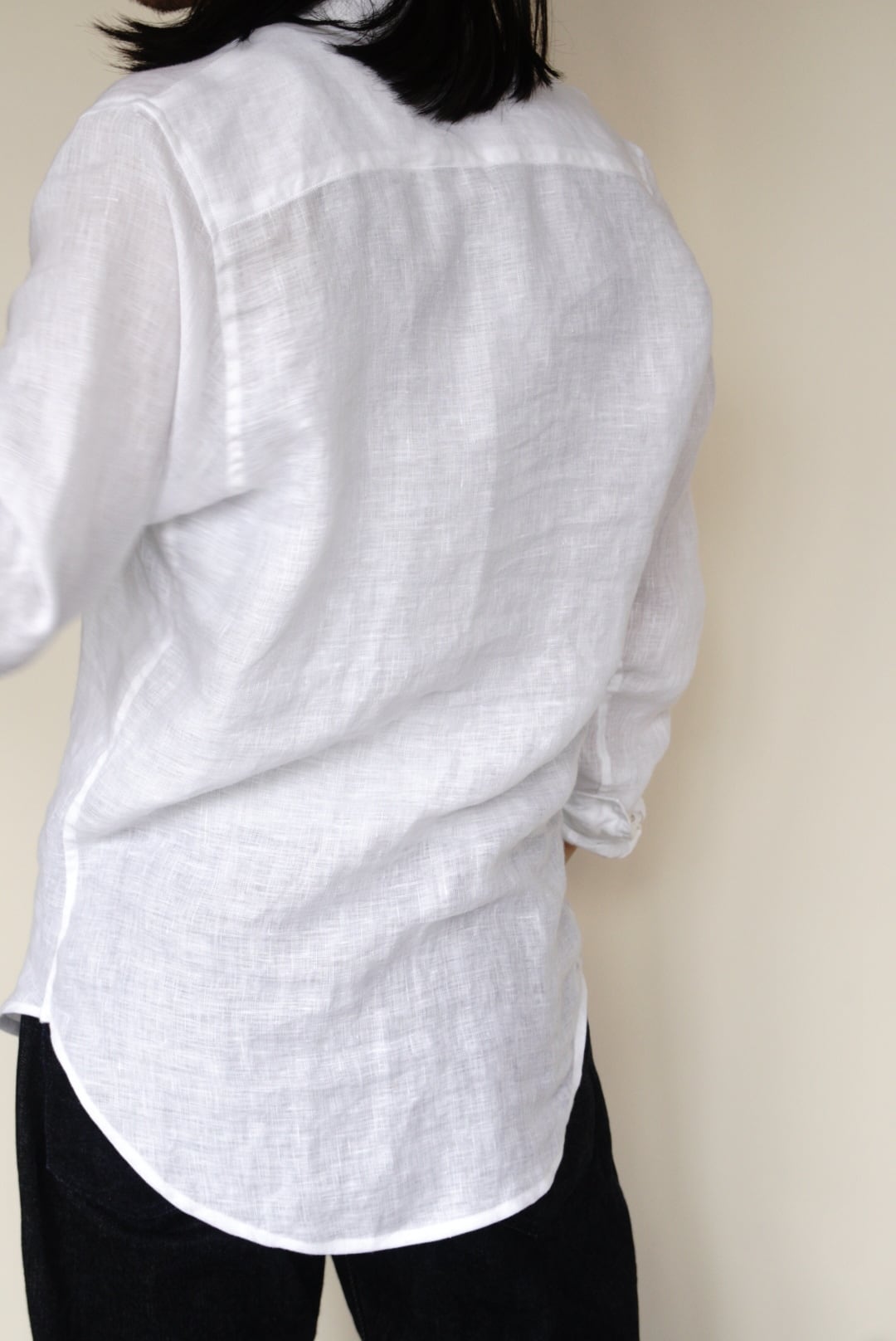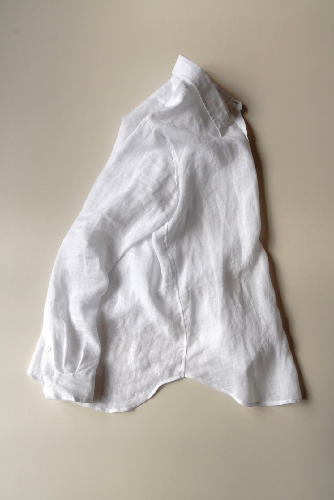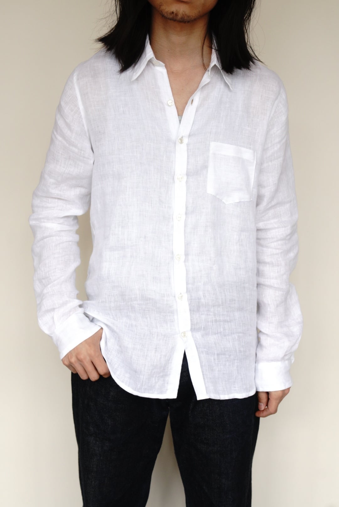 ベルギー製の上質なリネンを使用し、程よい軽さと透け感が涼やかな印象を与えます。洗いざらしたような柔らかなテクスチャーと、縦長でスリムなシルエットが特徴です。