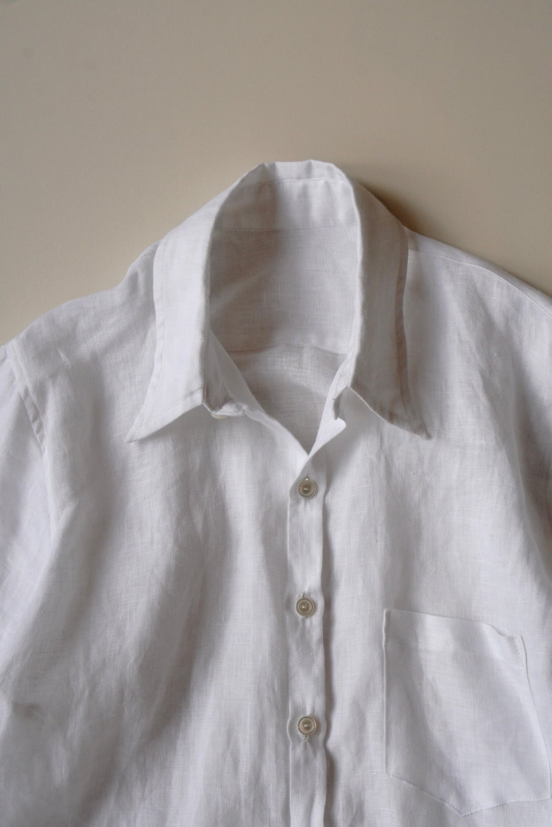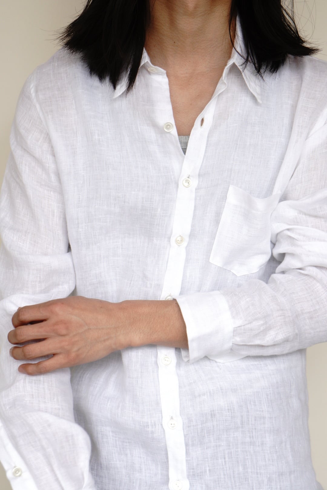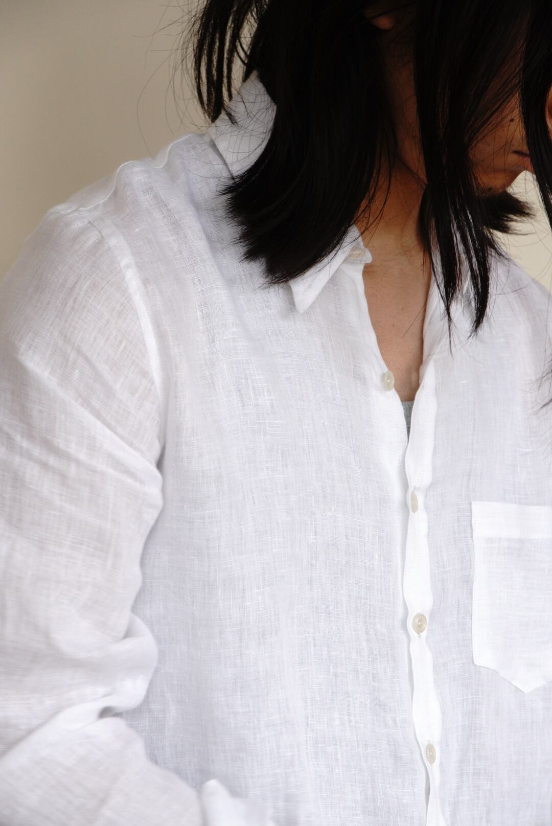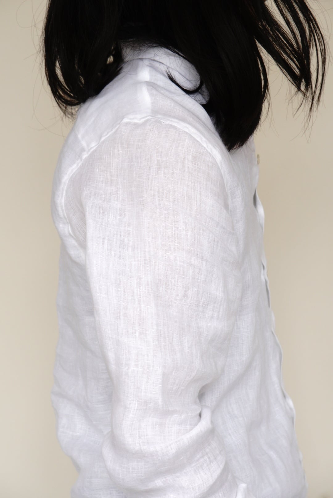 ベルギー製の上質なリネンを使用し、程よい軽さと透け感が涼やかな印象を与えます。洗いざらしたような柔らかなテクスチャーと、縦長でスリムなシルエットが特徴です。